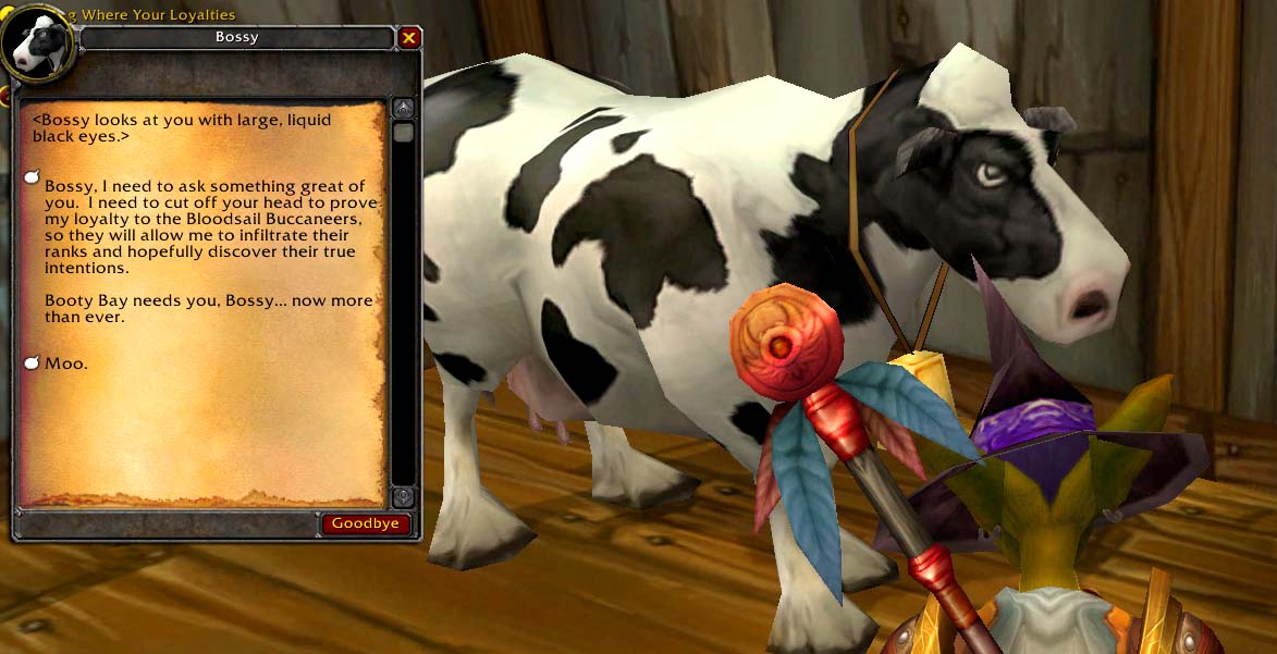 I was once coerced into killing Bossy the Cow by some mean ol’ NPCs. As I’m sure you can understand, I found this to be a horribly traumatic experience. Here is my question: is this the real Bossy, your Bossy, the only Bossy who really matters? If so I shall feel even more like a heel and boycott that quest on any other character I ever run who ventures anywhere near Booty Bay. Ever.