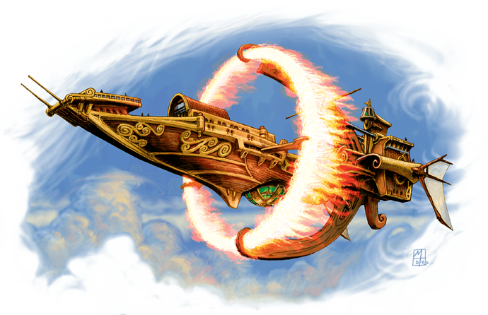 Elementals bound to airships aren't entirely aware of their condition. While technically sentient — possessing Intelligence and even language— "raw" elementals are extremely alien beings that don't perceive reality or the passage of time in the same ways that creatures of the material plane do. More than anything, a raw elemental wants to express its nature. A fire elemental wants to BURN. When an airship is operating at peak efficiency, that's what the elemental experiences; the fire elemental in the ring doesn't even realize it IS bound, it just knows that it's BURNING. The challenge to the pilot is essentially to keep the elemental calm. The more excited it gets, the more energy flows into the systems... and while this might seem like a good thing, it actually runs a risk of overloading the focusing nodes and burning out the elemental engine—initially causing the loss of secondary systems, and eventually causing the elemental ring to collapse and the ship to crash.