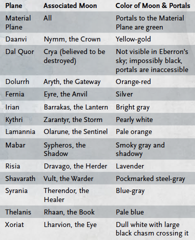 Planar Extensions. Personally, I want the moons to be unique worlds that are influenced by their associated planes, but that are distinctly different from what you’d find in those planes. I’d rather have Vult have a Gith empire than to just make it another front in the war between the celestials and fiends of Shavarath. However, a moon could certainly have a region that is either a direct extension of a plane or that hosts the denizens of the plane. It could be that the Feyspires of Thelanis appear on Rhaan as well as on Eberron, and that explorers could find Pylas Pyrial waiting for them when they land. Or people could land on Aryth to discover a city inhabited by the ghost of their lost loved ones… but is it real, or some sort of deadly trick?
