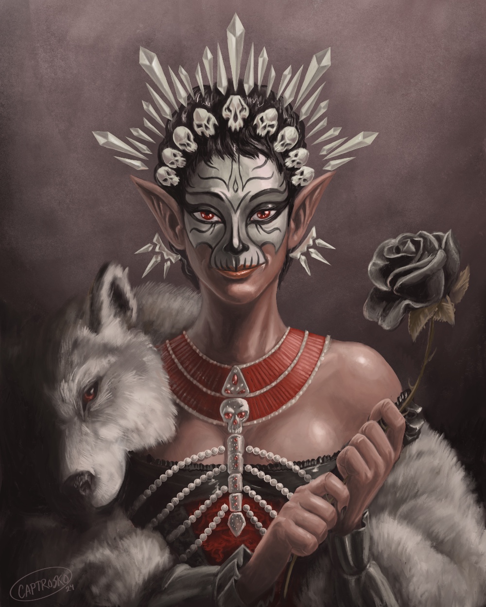 Etrigani is canonically chaotic in alignment, and I see this as reflecting a refusal to embrace the weighty traditions of Aerenal. This ties to her role in Karrnath and the Blood of Vol. The Undying Court asserts that all Mabaran necromancy is destructive, slowly eating away at the lifeforce of Eberron. I see Etrigani as challenging this fundamental precept and seeking to learn more about the Seekers and their ways—studying how the Seekers use their rituals to contain the deadly energies of Mabar, and interacting with Mabaran undead who haven’t become monsters. I see her as wanting to limit the widespread use of Mabaran necromancy and the role of undead, but still being willing to explore and to learn. This takes the idea that her marriage was her choice and not a mandate from Aerenal. She is a minor noble, whose strange gift and resistance to tradition always made her something of an outsider; the Sibling Kings are watching Etrigani, but she’s not their servant. In this vision of Etrigani, she is with Kaius because she truly loves him, and because she wants to help him stabilize Karrnath and help his people.