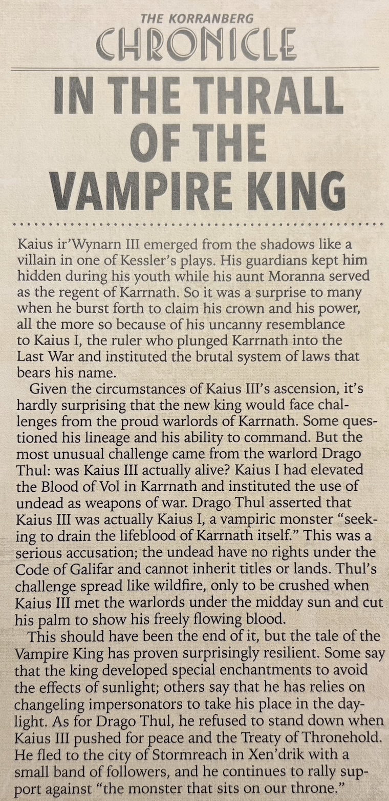 Kaius III is Kaius I. If this is the case, then then the man who claims to be Kaius III is actually Kaius I — the last of the heirs who set the Last War in motion. This makes him a powerful individual carrying a terrible burden. He's the man who drove his country into war, and instituted the harsh Code of Kaius. And he's the man who made a bargain with Lady Illmarrow, and paid a terrible price for it. He slew his beloved wife. If you follow canon, he turned his granddaughter into a vampire, and either killed his great grandson or imprisoned him... all because he believes that he is the only one who can do what has to be done. While he seeks peace, Kaius I is canonically lawful evil; what we've always said about this is that it reflects his absolute view that his ends justify his means. Part of the point of Kaius I as Kaius III is that he's trying to restore the world he helped break—but he's been a monster for so long that it's hard to change his ways. We've said before that it's hard to maintain empathy as a vampire; Kaius I is a perfect example of that. On some level, he wants to be a good; but it's hard for him to remember what that even feels like. Looking to the newspaper clipping, the point is that Kaius I IS a vampire, but there's lots of ways for him to stage scenes that make this seem impossible.