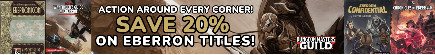 This month is the 20th anniversary of the Eberron Campaign Setting. But even after twenty years, there are many elements of the setting that have never been explored in depth, whether in canon wizards content or my own creations. However, over the last four years people have been able to release their own Eberron content on the DM's Guild and at this point there are hundreds of products out there... And for the next three days, all Eberron products are 20% off at the DM's Guild!