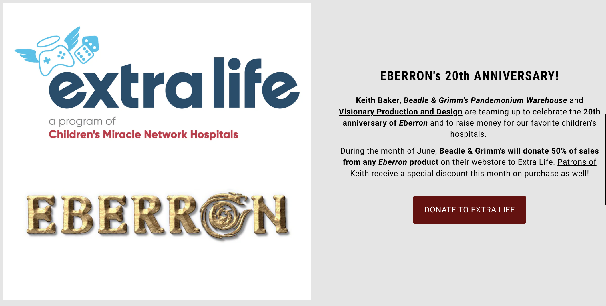 It's not the DM's Guild, but if you want to lend a hand to a worthy charity, Beadle & Grimm's are donating 50% of the profits on their Eberron products to Extra Life this month, and there's a raffle if you want to donate directly!