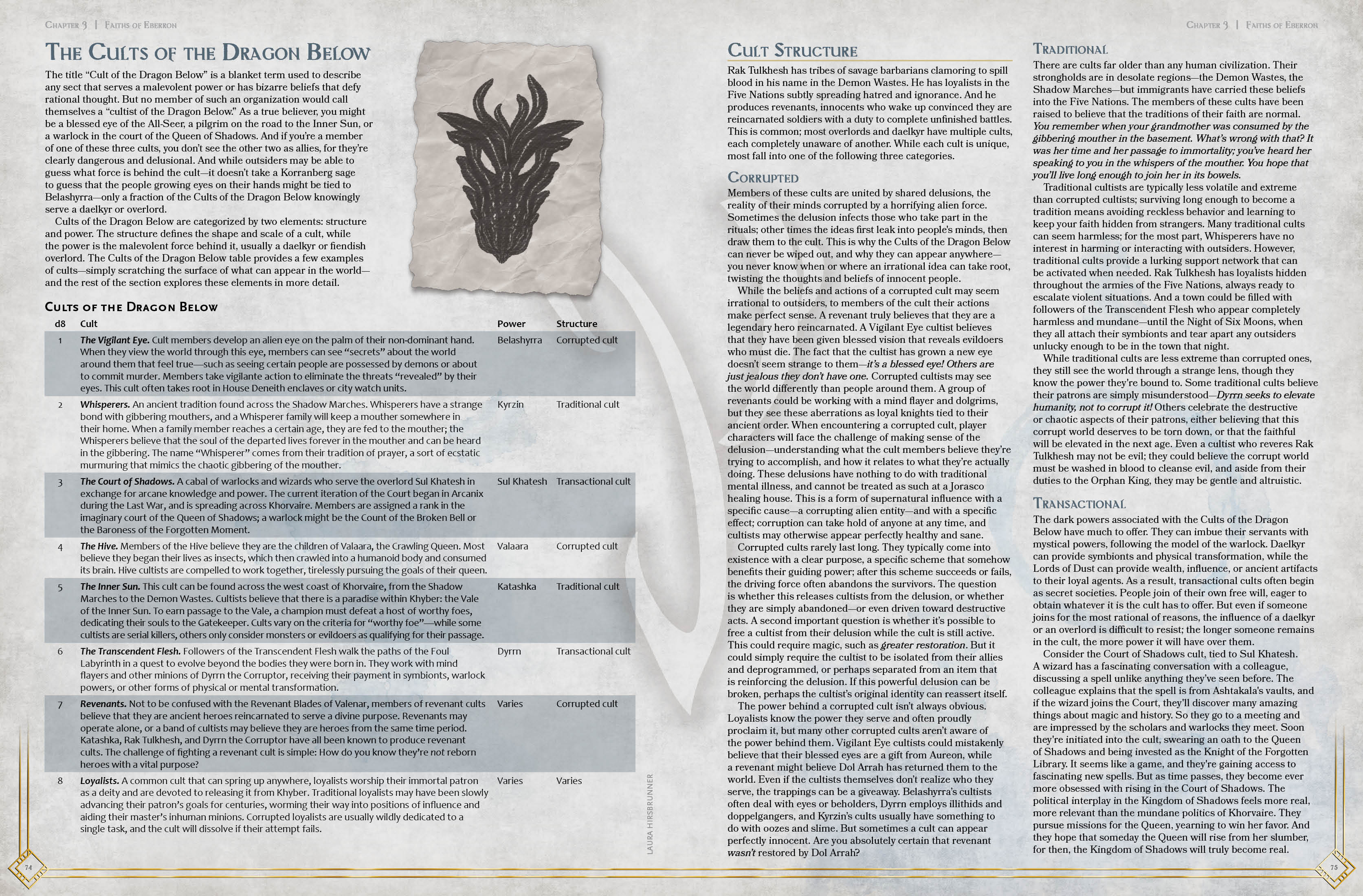The Cults of the Dragon Below have been a part of Eberron from the very beginning, but there's never been much detail about them. The basic idea has always been that "Cult of the Dragon Below" is a general term applied to a vast array of disparate sects driven by delusions or by ties to a dark power (typically a daelkyr or an overlord). But there's only been a few cases where we have concrete examples of specific Cults of the Dragon Below. The Whisperers and the Inner Sun have both been mentioned in Dragon articles, while the cult in Khyber's Harvest are traditional loyalists tied to Belashyrra. In Exploring Eberron, I wanted to go deeper—to give very concrete examples of cults and the powers behind them. How do the cults of Dyrrn differ from the followers of Valaara or Sul Khatesh? Beyond the basic introduction shown above, this section presents ten of the dark powers that create Cults of the Dragon Below and explores their goals, methods, and beliefs.