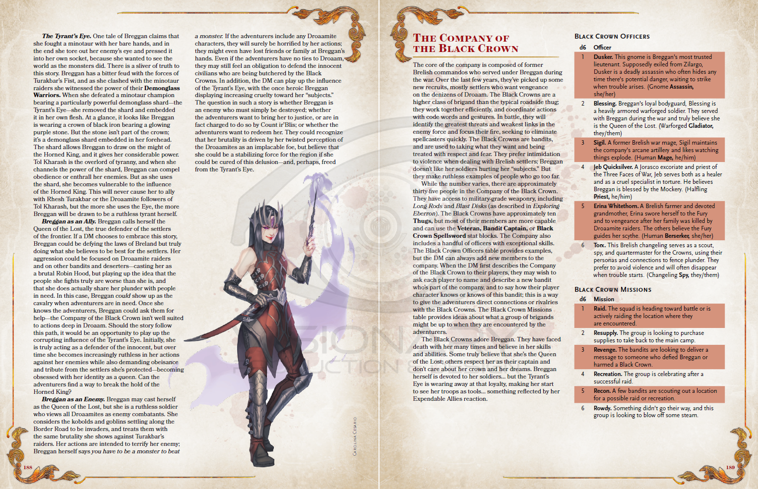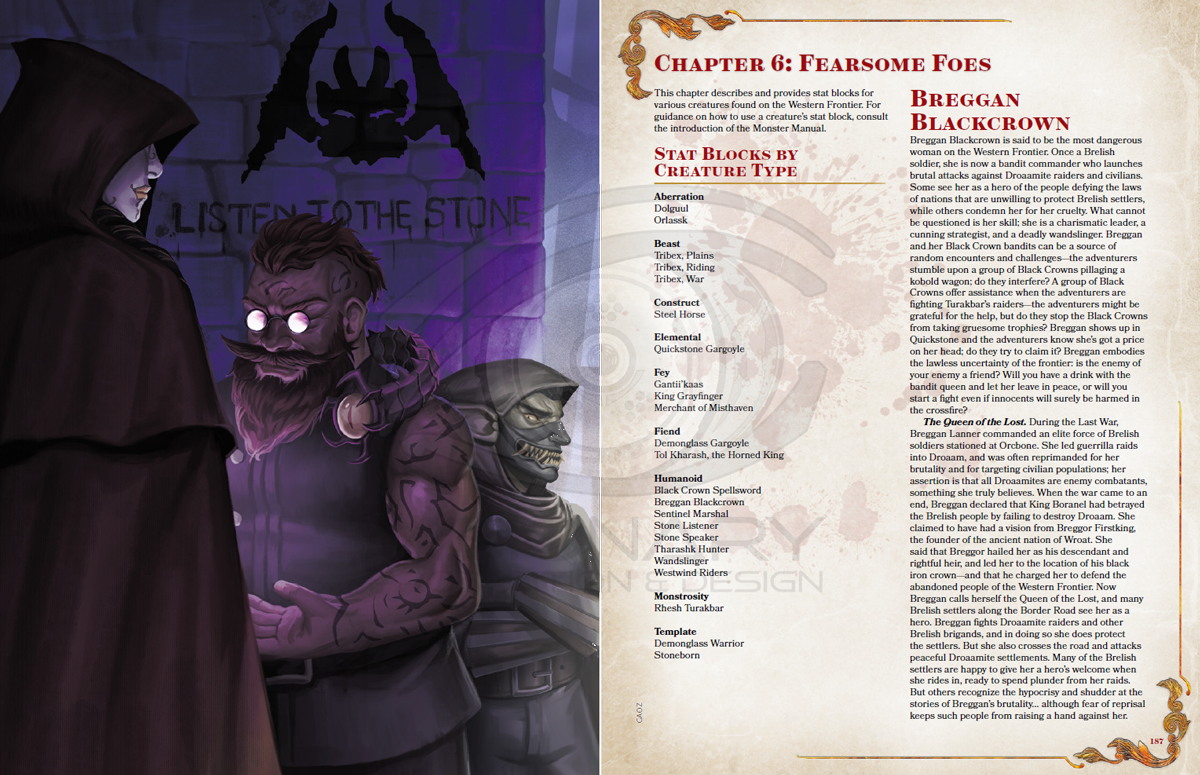 Frontiers of Eberron is coming out on September 17th! You can preorder it now and get a free Roll20 Conversion of the adventure "Heart of Stone." For now, here's a sneak peek at the opening of Chapter Six, so you can see the new creatures that are included in the book! The first two pages were posted on social media, but here's the next two pages as well, introducing the bandit queen Breggan. Her stat block is on the next page, but you'll have to get the book for that! meanwhile, my patrons already have previews of the College of Wands Bard and the Merchant of Misthaven. If you want to get access to those—and to support my writing on this site—join my Patreon!