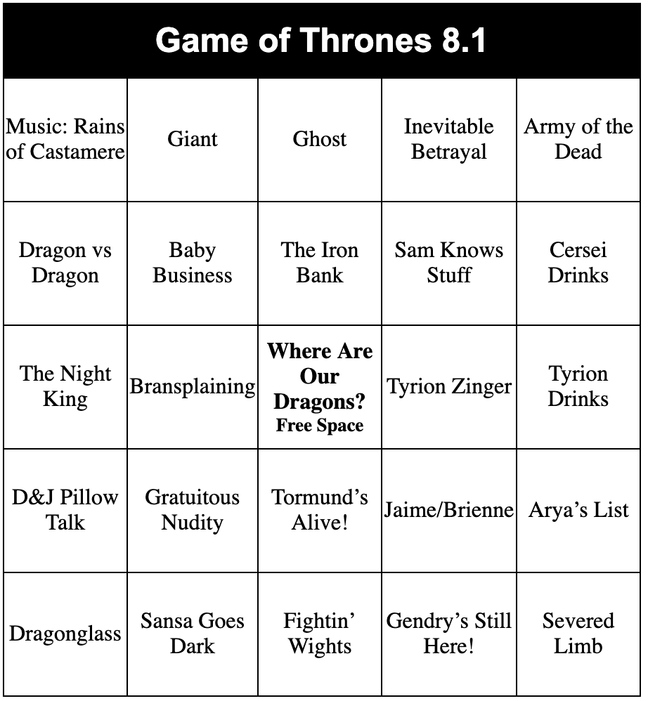 - You'll have to decide if you'll allow the name of a thing being spoken to be enough to fill a space, or if it needs to play a more significant role in a scene. Can you mark off a square just because someone in the show SAYS "The Night King" or "The Army of the Dead," or do we actually need to see them on screen?