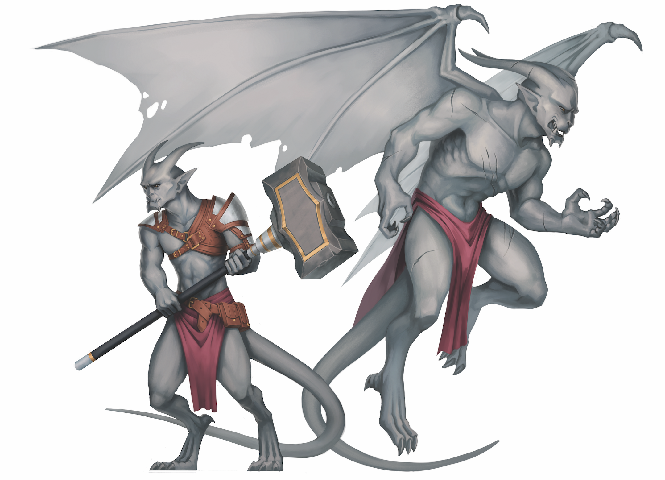 Gargoyles are elemental creatures, and their physiology defies all natural law. When a gargoyle stands still, it is indistinguishable from a stone statue. They are made of light, inanimate stone… and yet, when they choose to move, they can. This same illogic applies to their wings. Gargoyle wings can take many forms, but the vast majority couldn’t possibly keep a gargoyle aloft, and yet somehow they fly. Some scholars believe the gargoyles fly through an instinctive manipulation of elemental air, but nothing has been proven. With that said, the fact that gargoyles have the elemental type doesn’t mean that they have any planar connection or any bond to other elemental creatures. They are elementals because they are creatures of animate stone.