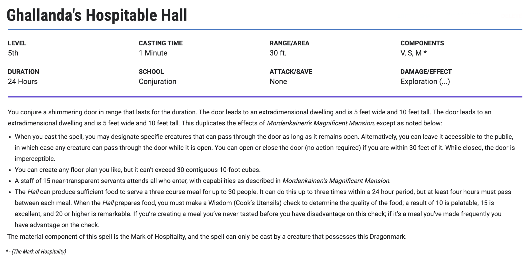 - At 5th level, I’ve added the option of Ghallanda’s Hospitable Hall. Hallow is a powerful spell, but it’s very limited in its use; it has a 24 hour casting time and a 1,000 gp casting cost; it’s not something an adventurer can use on a regular basis. Beyond this: Mordenkainen’s Magnificent Mansion was one of the original options for the Greater Mark of Hospitality in the 3.5 Eberron Campaign Setting, and for me it’s always been part of the flavor of House Ghallanda. Part of the point of the Wandering Inn is that you have mansions inside wagons. With the current structure it’s awkward to give a Dragonmark the ability to cast a 7th level spell; so I’ve created Hospitable Hall as a slightly weaker version of Magnificent Mansion. Note that this is a spell that is only supposed to be available to characters with the Mark of Hospitality—emphasized by making the Mark a component of the spell. For most people, this is still a 7th level effect.