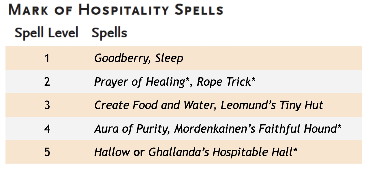 The Mark of Hospitality has three aspects: Food, Shelter, and Soothing. The ability to provide nourishing food is a key aspect of the Mark of Hospitality. Anyone who bears the Mark has the ability to Purify Food and Drink. The greater gifts of the Mark allow heirs to produce food from thin air. When cast through the Mark, Goodberry is called Mighty Morsel; rather than producing berries, the spell creates ten pellets that provide the sequential flavors of a three course meal. Prayer of Healing is called Fortifying Feast: when cast using the Mark, the ten minute casting time involves conjuring a small meal which must be consumed by the beneficiaries. Ghallanda’s Hospitable Hall allows the caster to create a meal for up to thirty people! For all of these food related spells, the caster must make a Wisdom (Cook’s Utensils) check to determine the quality of the meal; 10 is acceptable, 15 is excellent, and 20 or higher is superb. When casting Create Food and Water the caster has disadvantage on this check; this food tends to be bland, and it takes an exceptional chef to imbue it with compelling flavor.