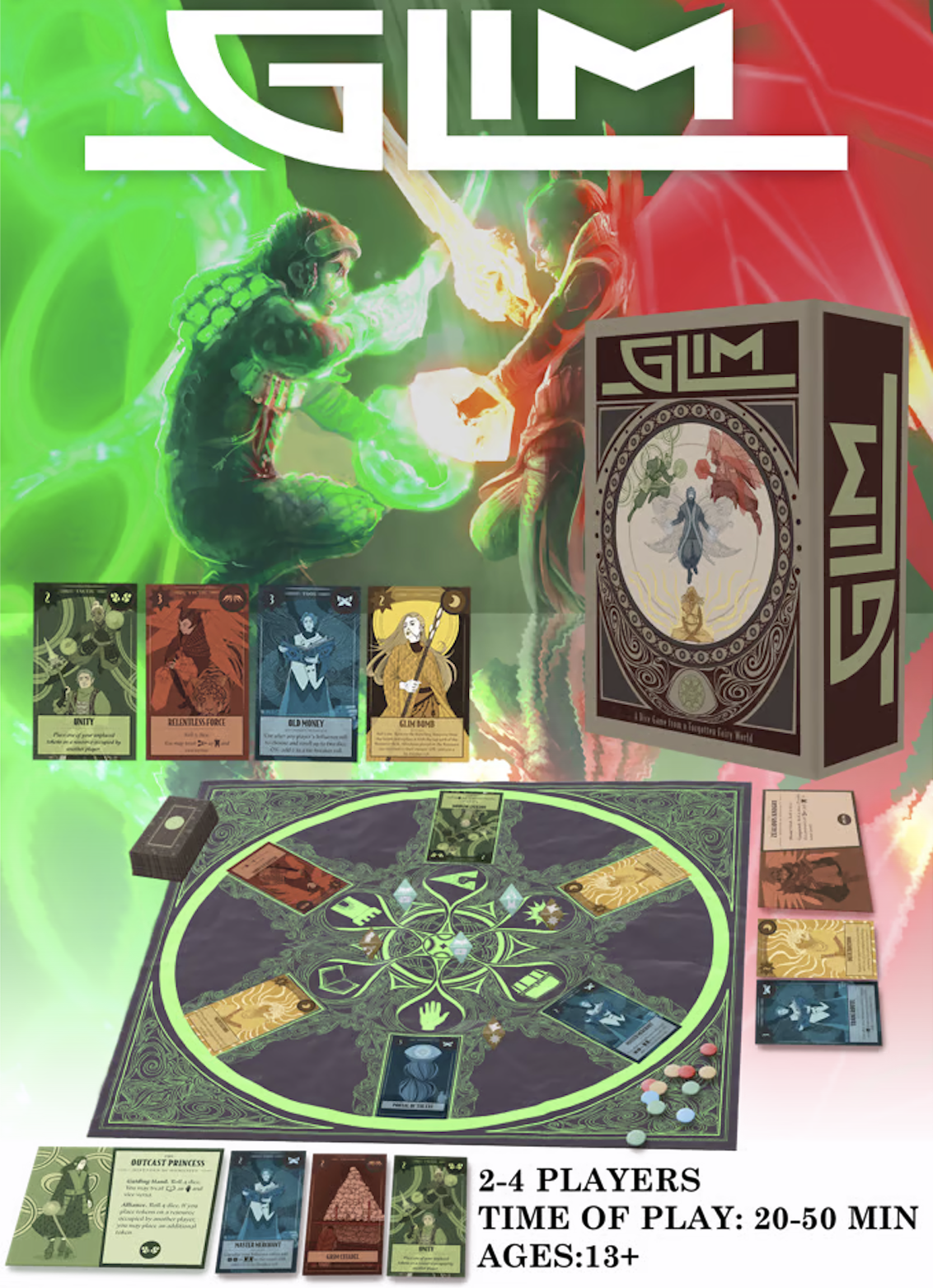 So Glim is easy to learn, but the shifting combinations of Dominion and Resource make every session unique. Beyond that, as with Illimat, our goal was to make something that feels like a beautiful artifact. It uses a cloth board, unique eight sided dice, and stunning artwork by artist Ren Lindroos—drawing players into the magical world of Hada.
