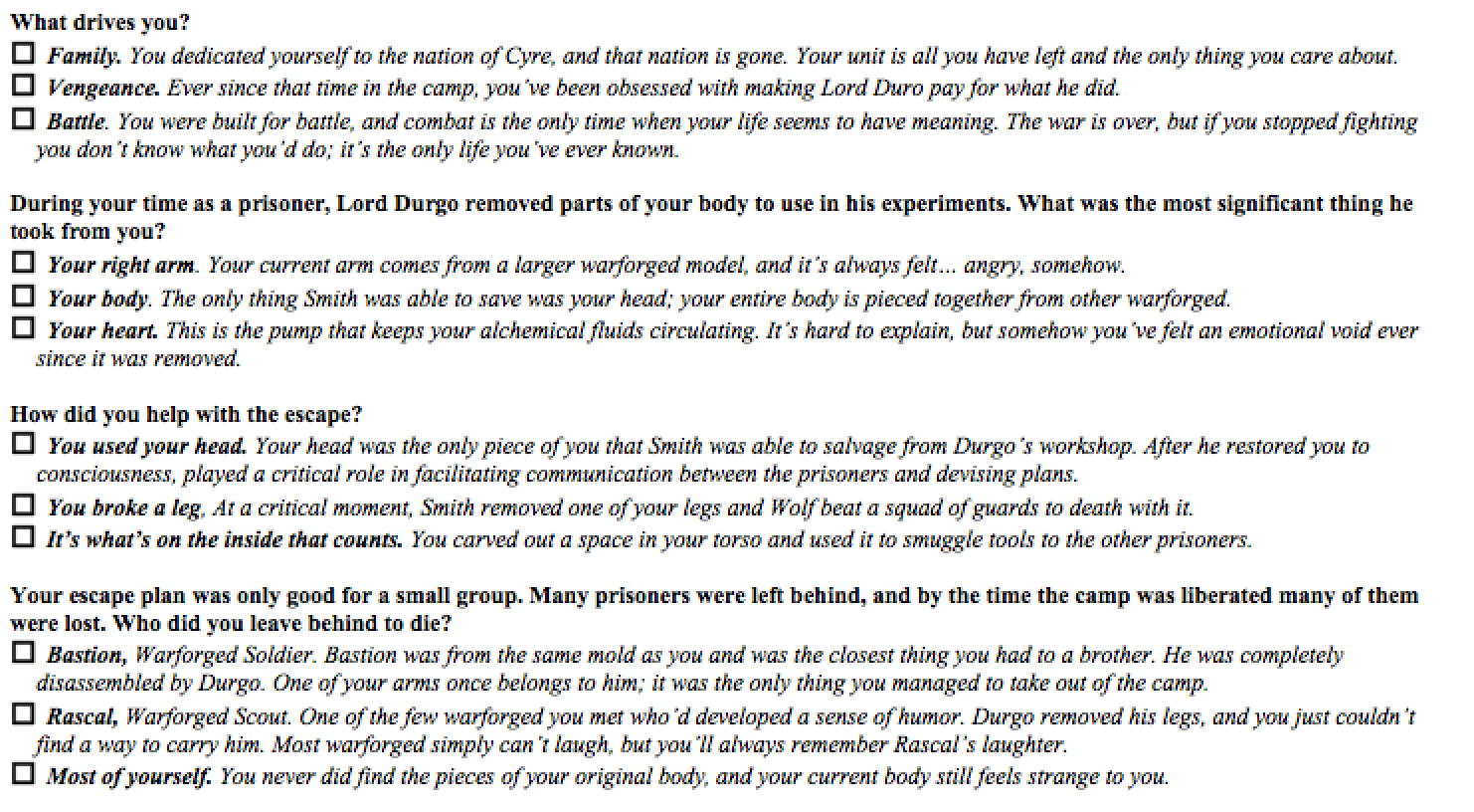 Another issue is that some players may be afraid to develop a background that gives them connections to the world because "The GM will use this against me" -- or that they don't want to have any sort of background element that implies failure. It's important to make clear that this isn't a competition. If they don't want you to "use things against them" you shouldn't do it; you're trying to build an experience you're all going to enjoy. But talk to them about stories or movies they enjoy and their favorite characters. Compelling characters generally aren't perfect paragons with no connections to the world around them. They're people who overcome past failings, who fight to protect the things they care about, who learn from mistakes. In the questionnaire above, I don't give the players the option of having pulled off a perfect escape: someone got left behind, and it's up to them to decide who. Because that failure gives the story weight. Their character isn't perfect. The story is real, and bad things can happen... which makes the triumphs they have in the future more meaningful. I may offer them a set of three characters who were left behind, as in the example above, but once they've made that choice I'll ask them to help me add details about that lost friend. What was your favorite joke Rascal told you? The more the player personalizes this NPC, the more it becomes their story, and the more meaningful it will be for them if they have a chance to save Rascal in the future.