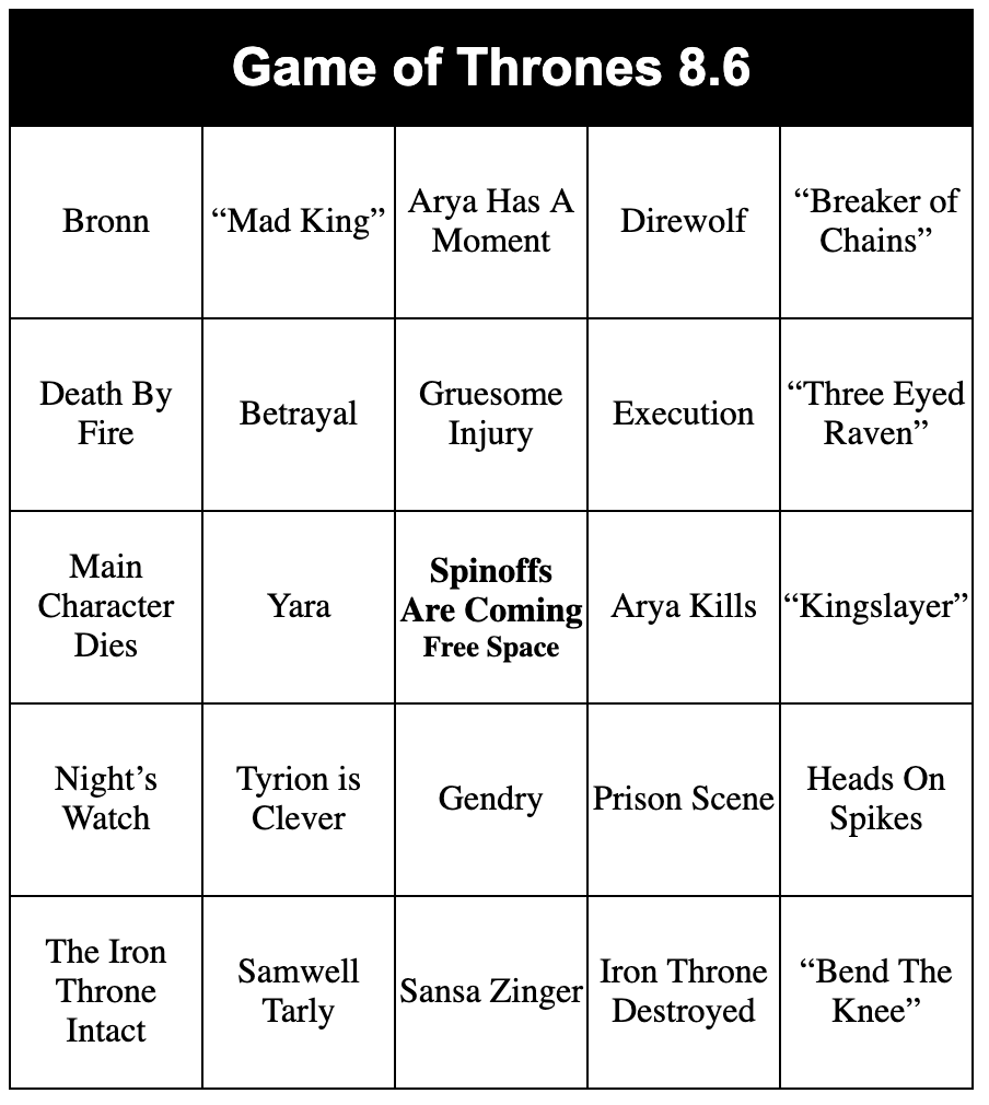 After many years, the final episode of Game of Thrones Bingo is upon us. Will the Iron Throne be destroyed? Will we go full tyrant with executions and heads on spikes? Will we have a final opportunity for someone to pet a direwolf? We'll find out in a few hours! Here's a set of 14 cards: