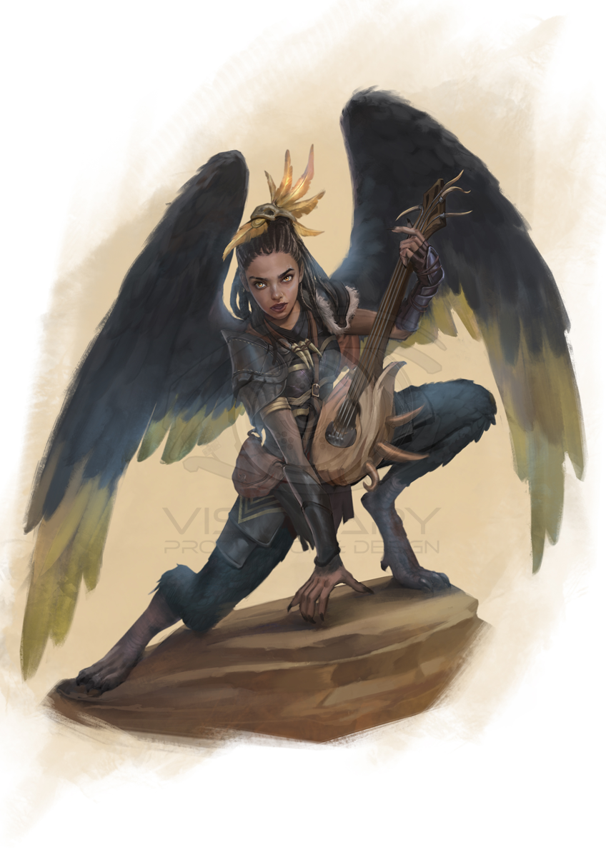 Harpies blend avian and human elements, possessing functional wings and birdlike legs ending in clawed feet. But the most remarkable feature of a harpy is their voice. Arcane power flows through a harpy and into their words, allowing them to manipulate emotions and to charm even the most hardened of hearts. While there are always exceptions, most harpies are passionate and energetic; the power of their song reflects their own surging emotions. Most enjoy the freedom of flight, expressing themselves through sound and motion.