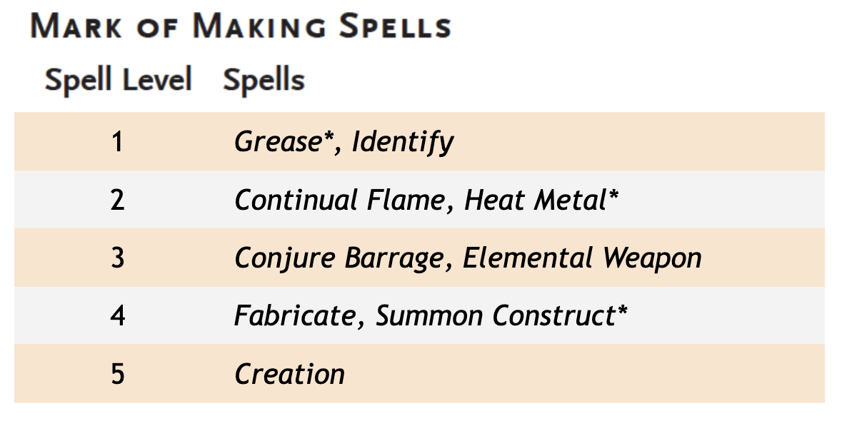Kanon vs Canon. Three of the spells on the list above are marked with asterisks, and that’s because they vary from what’s presented in Forge of the Artificer. In the original Eberron Campaign Setting, two of the Mark of Making’s spells were taken up with Repair Damage; Mending was a full spell rather than a cantrip; and Creation was split into two spells. So in translating the Mark of Making to 5th Edition, there’s a lot of space to fill… but I don’t love the choices made in canon. I associate Cannith with metal, so using the Mark to lubricate and heat metal makes sense to me—more sense than Floating Disk and Spiritual Weapon, both of which are more about projection of force and levitation. At 4th level, I prefer Summon Construct to Stone Shape. I don’t feel like stone is something we’ve called out as playing a major role in Cannith, while constructs have been part of its story since the first Gorgon!
