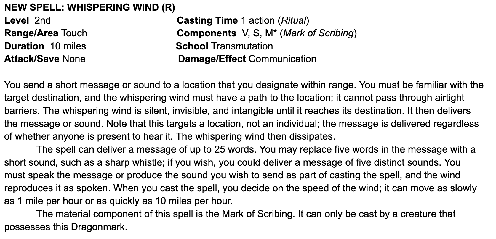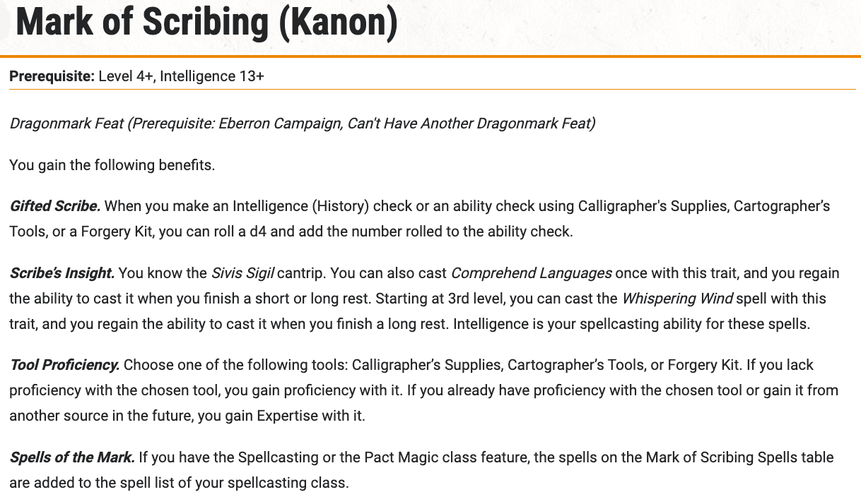 Kanon vs Canon. In general I prefer to work with existing canon, but it’s important to me that the Dragonmarks feel consistent and support the role of the House within the world. House Sivis was built on two spells that don’t exist in Fifth Edition. Arcane Mark drove the idea of Sivis notaries, while Whispering Wind was the foundation for the Speaking Stones—with the idea that the Speaking Stone carries the message faster and farther, but it’s still working off the basic effect of Whispering Wind. Beyond this, the canon Mark of Scribing feat feels significantly more limited than many others. Compare Scribing to Sentinel. Sentinel gets bonuses to Insight and Perception, two consistently useful skills; Scribing gets History and Calligraphy. Sentinel gets Shield, a spell that’s useful in almost every adventure; Scribing gets Comprehend Languages and Magic Mouth, again both very situational. So, looking at key changes…