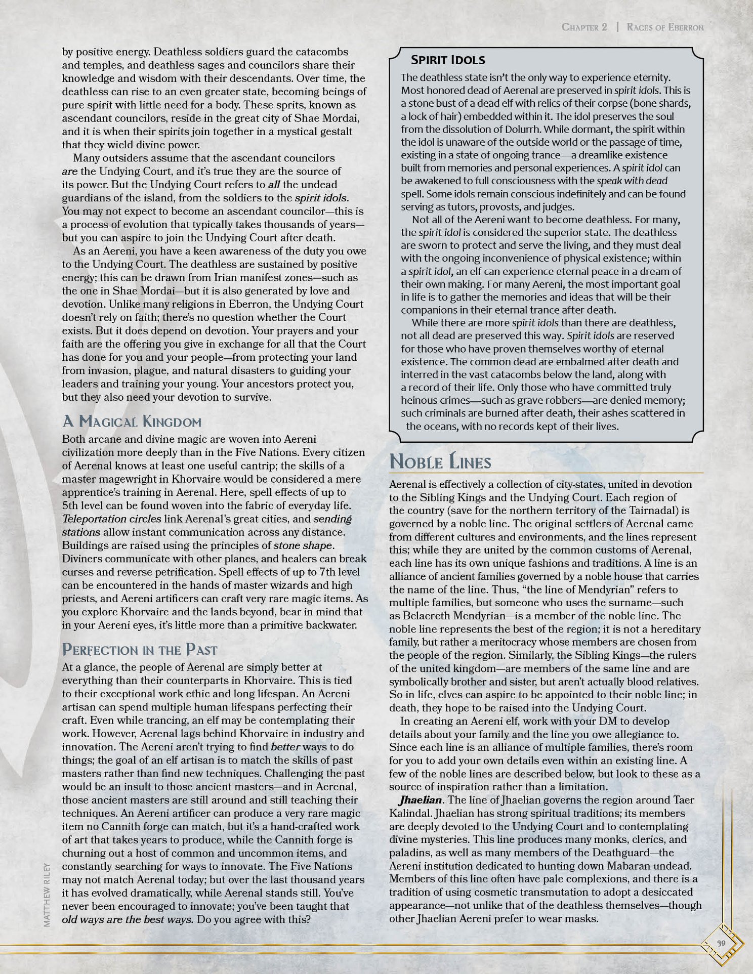 So no: the elves of House Thuranni and Phiarlan aren't Aereni. They intentionally severed their ties to their homeland and have no loyalty to the Undying Court or the Sibling Kings. And since elevation to the Undying Court—whether as a spirit idol or as one of the deathless—is an honor the Aereni bestow on their most celebrated citizens, it is not offered to those elves who have abandoned their homeland and its traditions.