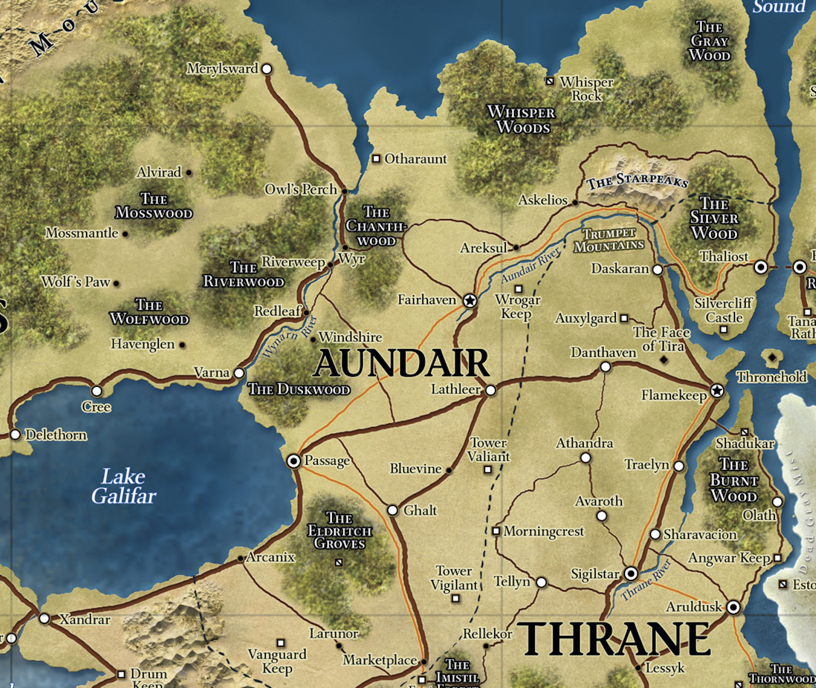 I've already discussed Arcanix—that it was a small village that took on its current importance when Aundair moved the floating towers there. But beyond that, I feel that when you go beyond the Eldritch Groves you're dealing with territory that was technically Thrane on the map but that had a very weak cultural connection to the nation. The Year of Blood and Fire is a foundational element of modern Thrane culture and a critical part to the deeply engrained cultural devotion to the Silver Flame. I think it's reasonable to say that Bel Shalor's influence never spread beyond the Eldritch Groves—that the people of that region didn't suffer in the Year of Blood and Fire and largely maintained their Vassal faith through to the present, making many of them quite happy to shift their loyalties to Aundair or Breland. In particular, I think it's logical to assume that the Eldritch Groves have strong ties to Thelanis, and that the people in that region had fey-related customs more typically associated with Aundair. Meanwhile, Xandrar is so far from Flamekeep—separated by mountains and water—that I feel it was effectively an independent culture that just happened to be assigned to Thrane on the map, much as Droaam was technically Breland but the residents of the region didn't consider themselves to be Brelish.