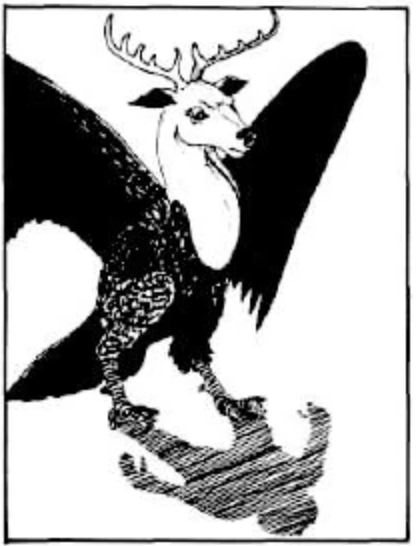 The peryton is a creature created by Jorge Luis Borges that combines the features of a stag and bird. Like the medusa and the gorgon, D&D's interpretation of the peryton has always diverged from the source material. As presented in 5E D&D, the peryton is a monstrosity with human-level mental ability scores. Perytons understand Elvish but can't speak. They are noteworthy for casting humanoid shadows, as seen in the image from the original AD&D Monster Manual I've included above. The 5E peryton is resistant to non-magical physical attacks, though no explanation is given for this resistance. And the story is suggested that the perytons were formed when carrion birds fed on the corpse of someone who died associated with murder and magic.