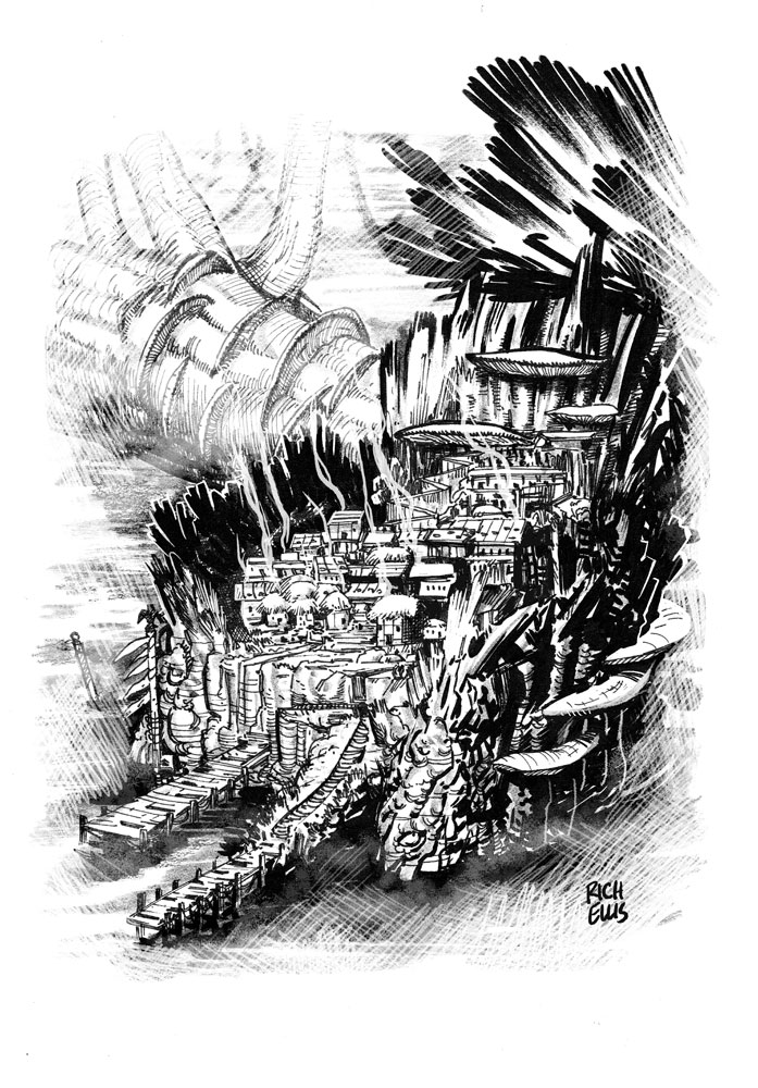 But is the Wood actually like? For a start, it holds trees that don't exist in our world. Greatpines are similar to the pine trees we know, but have thicker trunks and can reach heights of over 250 feet. The awe-inspiring bluewoods are more massive than our redwoods. But as you go deeper, you can encounter something different. This is a point where I break with canon—keeping the same general idea, but shifting it slightly. The ECS describes a specific region called The Guardian Trees, where the trees "dwarf the greatest redwoods"—but this is a very specific region that only spans about 30 miles. In my campaign, I take a different approach. First, I use the term guardian tree to refer to the Eldeen Ada. Second, in my Towering Woods those immense trees aren't limited to a tiny region; they are spread across the forest. I call them titans—primordial trees that dwarf anything in our world, potentially thousands of feet in height. These titans are infused with primal energy—there's the possibility they are literally the first trees, so they are sustained beyond what should be possible for any mundane fauna. The article I linked is tied to my Phoenix: Dawn Command setting, in which the titans have all fallen. In the Towering Wood I'd say most of the titans are still standing, but that there are a few that have fallen. This allows for the possibility of stumptowns (as pictured above, communities in the stumps of titans) or for communities or dungeons carved into the densewood trunks of fallen titans. Unlike the ECS, I spread these throughout the wood, but they are still rare; there's a few dozen of them in total across the entire Wood. But each one is a truly remarkable landmark, and a wellspring of primal power. Traditional magic doesn't work on a titan, so you can't just animate one of them. Some people believe that the titans are awakened but are simply too vast to perceive humanoids; others believe that they hold the spirits of all the druids who've died in the region. Either could be true. To date Avassh hasn't corrupted a living titan... but it could certainly have infested the trunk of a fallen one.