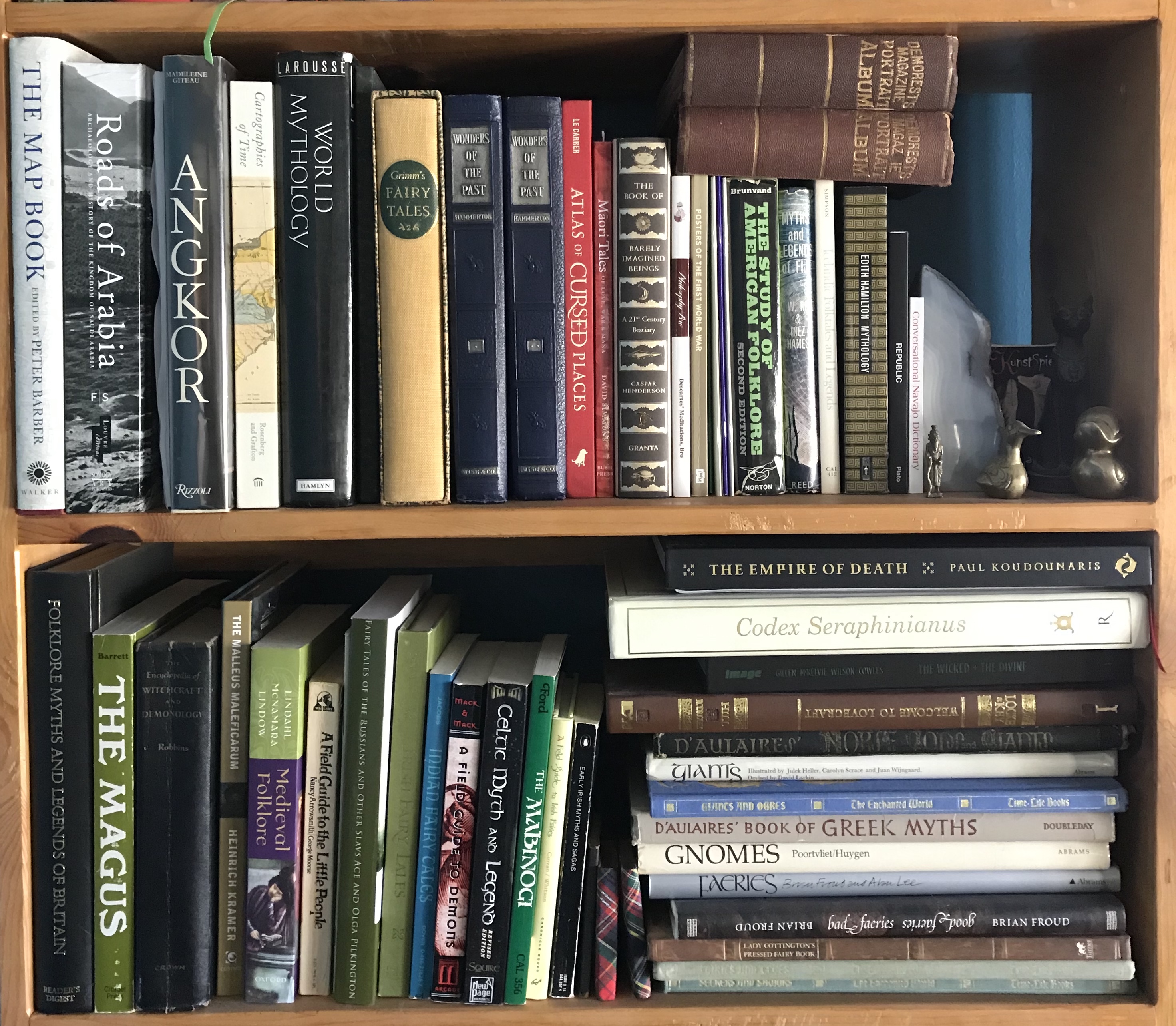 I think the simplest answer is to just share a picture of a few of my bookshelves. A Field Guide To Little People is certainly a favorite, as are the D'Aulaires myths. But I also enjoy books that take the style of faerie tale and folklore but tell unique stories, such as The Dictionary of the Khazars by Milorad Pavić; Night's Master by Tanith Lee; and Deathless by Catherynne Valente.
