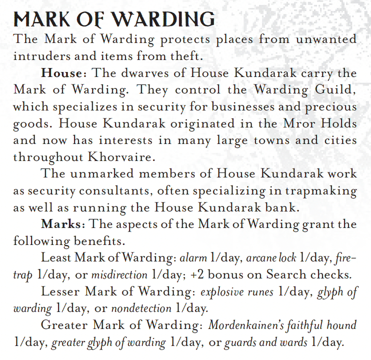 Over the course of the next year I'm writing a series of articles about the Dragonmarked Houses. The point of these articles is to provide my take on the houses—their culture, history, and hooks for characters or NPCs from those houses. As always, this work is kanon—it's how I use the houses in MY campaign and may contradict or ignore elements of canon lore. I've already written one of these articles, about House Orien. I've also written an article that considers various aspects of dragonmarks and how they work. But that's a long, speculative article, and I want to call out a specific element that I will be using as kanon in all of the articles I'm writing from this point on... and that concerns Lesser and Greater Dragonmarks.