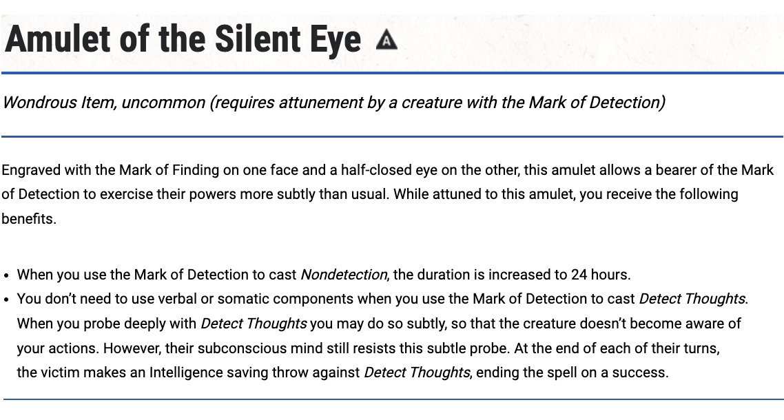Nondetection. Everyone knows that the Mark of Detection lets its bearer uncover secrets. Fewer people know that it can help bury them, as well. The Wolves of the Warning Guild specialize in counterintelligence and in making problems go away. In doing so, they often employ the Lesser Mark’s gift of Nondetection—whether to conceal themselves, a client, or an inconvenient object (or body) until a case can be closed or a problem solved. This ability is especially prized by the hunters of the Basilisk’s Gaze, whose quarry often protect themselves with divination. This comes to a minor house rule. The 2024 rules have reduced the number of effects that say a creature cannot be surprised; notably, the Weapon of Warning no longer provides this benefit. But I personally say that if any magical source provides immunity to surprise (as opposed to a skill or mundane class feature) that the benefit will not help against someone who is shielded by Nondetection. Likewise, in my campaign Nondetection protects from magical effects that are clearly forms of divination even if they are not identified as being divination spells—notably, a Wand of Enemy Detection.
