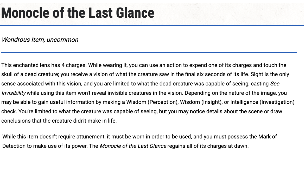 The limitation that “If the thing you named isn’t of legendary importance” bothers me. Critically, who makes that determination? It also seems like an arbitrary limitation on a spell that is supposed to be the greatest power of the Dragonmark. With this in mind, in MY campaign, the Greater Dragonmark doesn’t allow you to cast Legend Lore; instead, it allows you to run a Background Check. Name or describe a person, place, or thing. The spell brings to mind a brief summary of lore about the thing you named based on what is known about them by living bearers of the Mark of Detection. Think of a gestalt consisting of both the conscious and subconscious memory of living Medani. Has any Medani ever seen the person you’re asking about? Do you already have information that could be combined with another Medani’s observations to draw a new conclusion? So like Legend Lore, the more information you already have, the more information you will receive; and likewise, if the individual or object is well known in the Five Nations, then Medani will know more. And again, this is the function of the Private Eyes—to gather as much random information as possible, which may mean nothing to the observer in the moment, but which can be added to the gestalt for Background Checks. So if you ask about someone who is truly unremarkable or about an obscure relic from tens of thousands of years ago, you might not get any information (although here again, the Voice of Aureon includes sages who study history, and their knowledge is part of the gestalt). But if you ask about a criminal, you might draw on the information of a Medani inquisitive who solved a previous crime they were involved in… and you might know that they were seen in Sharn a week ago. As always, it’s entirely up to the DM to decide what information is provided, and the bearer of the Mark can’t ask for clarification; they get the information they get. But even if we imagine a random commoner—let’s say Jurian Cooper—who’s definitely not LEGENDARY, a Medani Background Check might say Jurian Cooper is a male human in his thirties who’s been living in the Callestan district of Sharn for at least a decade. He has been seen in the company of Ilsa Boromar on multiple occasions. Last week he was seen in the Broken Mirror in Callestan, drinking Old Bender and eating a tribex pie. This also touches on the difference between the Mark of Finding and the Mark of Detection. A Background Check can’t tell you exactly where to find Jurian Cooper. But it may point you to known associates, recent haunts, or provide useful details you’re not going to get from Locate Creature.