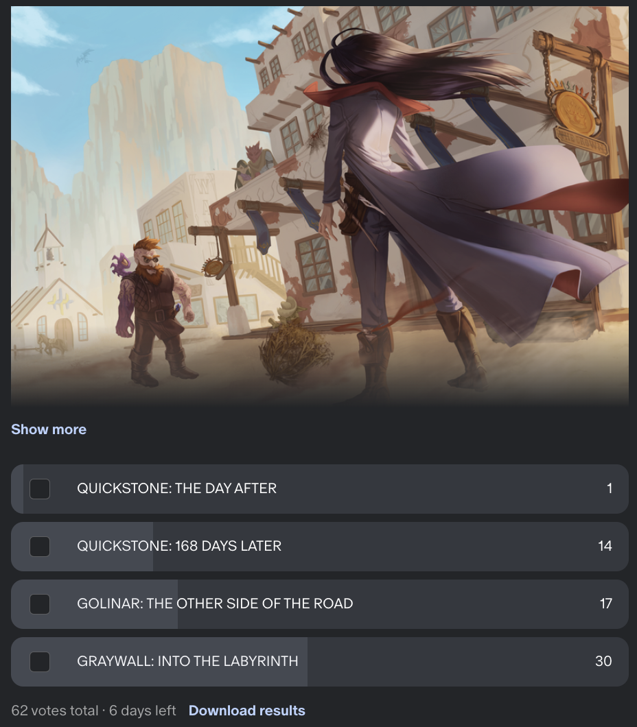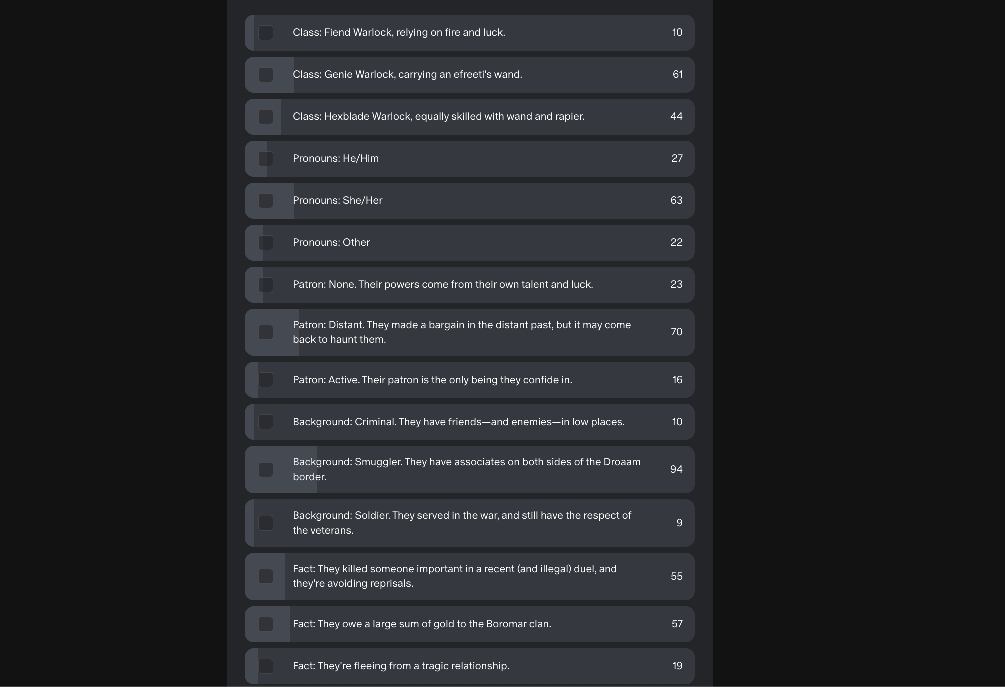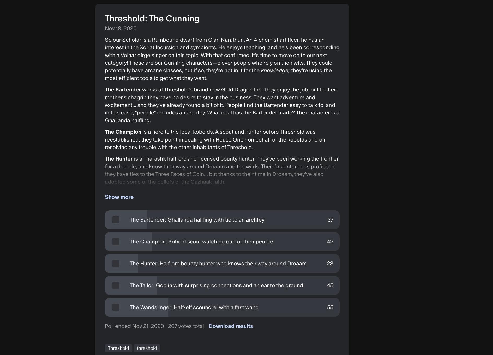 Why am I bringing this up now? Because after 24 sessions, my current campaign reached a satisfying conclusion and it's a good moment to start something new. There's a poll up on the Patreon that runs until Noon Pacific time this Wednesday, and the results will determine the plot of my next campaign. As soon as this is done, I will start an extended session zero process—using a series of polls to allow the patrons as a group to select the cast of characters and define aspects of the campaign. You can see a glimpse of what this looked like last time below. On Wednesday, the result of the poll will determine the nature of the next campaign, and I'll immediately get started with session zero polls to create the cast of characters. So, if you're interesting in playing a game with me sometime this year, this is your chance to get on board at the start of the new campaign and help shape the direction of the characters and the story. If that sounds like fun, check out the Patreon! And thanks for your time and interest!