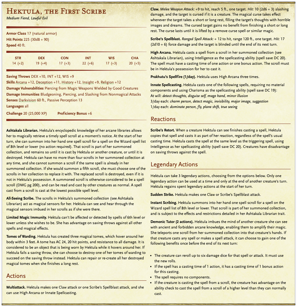 The adventurers plan a brilliant heist targeting the Library of Ashtakala... and something goes wrong. They find themselves face to face with the First Scribe, and it's time to roll initiative. What are Hektula's capabilities? Here's a stat block for you to work with, courtesy of Chronicles of Eberron designer Imogen Gingell!
