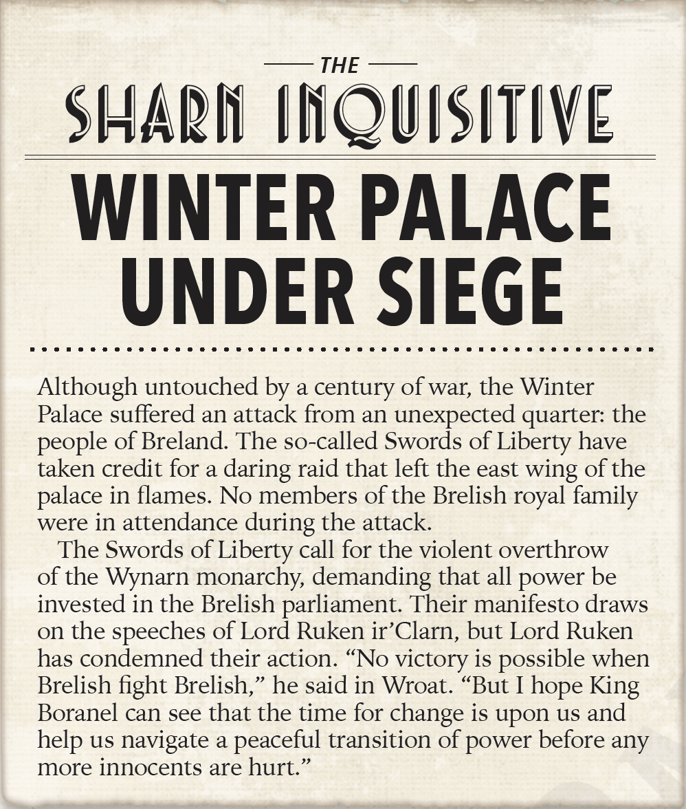 The Swords of Liberty began as a peaceful political movement, calling for King Boranel to voluntarily cede power to the Brelish parliament. In 996 YK, a statement from Beggar Dane took credit for an attack on Castle Arakhain that left the east wing of the Winter Palace in flames. Over the last two years, the Swords of Liberty have struck at nobles across Breland, saying that there will be no peace until the aristocracy is dissolved. According to Beggar Dane, even that victory wouldn’t mean the end of violence. Beggar Dane accuses King Boranel of betraying the Brelish people both by accepting the terms of the Treaty of Thronehold and providing shelter for Cyran refugees. Dane maintains that Breland could have easily won the Last War if its leaders had truly wished to do so; in certain tracts, he suggests that there is a conspiracy among all the ir’Wyrnarn monarchs, that Boranel has intentionally misled his nation to benefit his royal cousins. He promises that once the monarchy is overthrown, the new army of the common people will bring unity to all of Khorvaire—and that they will deal with both the “monsters to the west” (Droaam) and the “enemy we have welcomed in” (Cyrans).