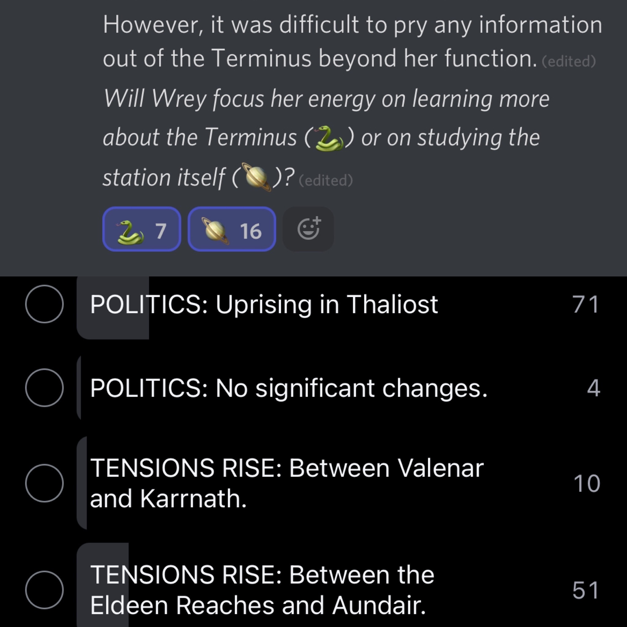 While only five patrons get to play in each session, I do what I can to give all of the patrons an opportunity to influence the story. I run one adventure each month; between sessions, I post polls on Patreon and occasional interactive story hours on the Threshold Discord that allow everyone to shape the future of the events. Oh, and did I mentioned that there's a Discord channel where I discuss the campaign and Eberron in general with patrons? One of my favorite things about TTRPGs is how the story evolves over the course of a campaign, and I enjoy finding ways for bring that experience to this format.