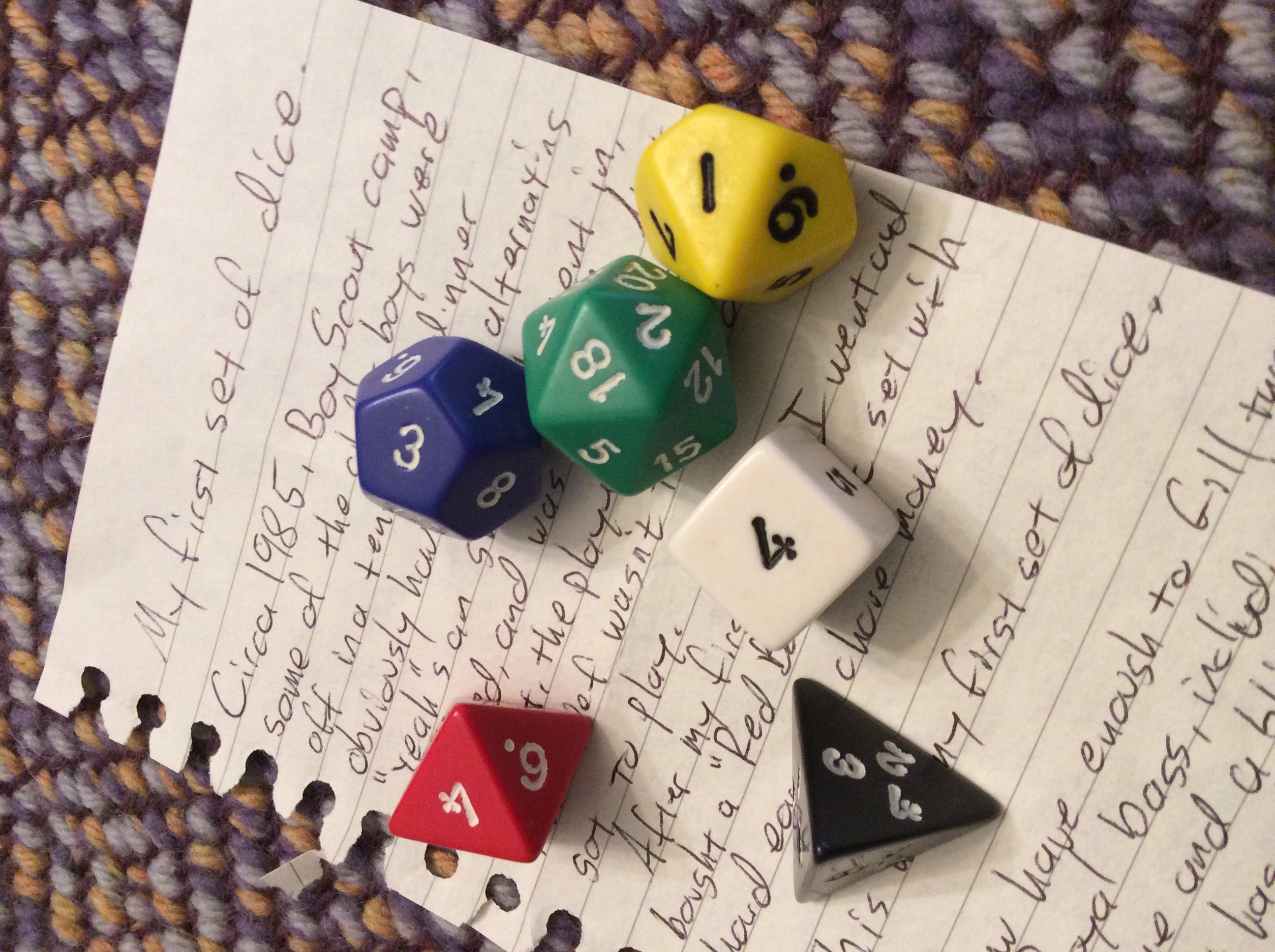 I'm kidding, of course... though you'd think the Boy Scouts might support Pathfinder. There really is a Game Design merit badge, but that's a relatively recent development. In 1985, Ed had never heard of roleplaying games or D&D. He just knew that some of the older scouts were up to something. He heard shouts of triumph and groans of despair coming from the tent where the boys were gathered. He pushed his way into the tent, watched the game unfold, and he was hooked. Next campout, the kid who usually played the Thief didn't show up. Ed swears he had nothing to do with this absence, but he took the seat at the table and picked up the dice. He's been rolling those dice for over twenty-five years. Now he's got hand-carved stone dice and a twenty-sided that blinks when he rolls a critical hit. He's got two Crown Royal bags filled with dice. But he's always kept his first set from his days playing the Red Box, and those are the dice he gave to me.