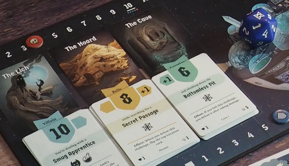 Each challenge comes with a deck of cards, and to defeat the Villain or escape the Cave, you must work your way to the bottom of that deck; the doublesided cards ensure that when you face the Lich a second time, you won't deal with exactly the same challenges. The basic mechanic is simple: declare what challenge you'll face, determine your strength against that challenge, and roll to see if you are able to defeat it and progress deeper into the dungeon. But once again, the most important thing about the challenge is the foundation it creates for the story. Who is the Lich's Smug Apprentice? What are they so smug about? How are you going to attempt to defeat them—will you best them in a magical duel, or will you cut them down to size with a well-placed quip? Will you go it alone, or do you need help from your friends—and if so, how will they help?