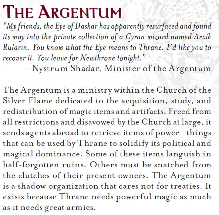 The Argentum. The Church of the Silver Flame is dedicated to defending the innocent from supernatural threats. The Argentum began as an arm of the Church dedicated to finding and either destroying or containing cursed objects or exceptionally dangerous magic items. This was always a duty the Argentum carried out in the shadows; even if an item deemed to be a threat was in a dragonmarked enclave or in the possession of a noble, the Argentum would find a way to get their job done. This made the Argentum the most experienced covert operatives of the Church (with the exception of Miron's Tears, who are SO covert that the Council of Cardinals has no oversight over them). With the shift to theocratic power and the evolution of the Last War, the Argentum was charged with additional tasks—namely, sabotaging powerful magical assets of enemy nations and acquiring arcane tools that could prove valuable to Thrane.
