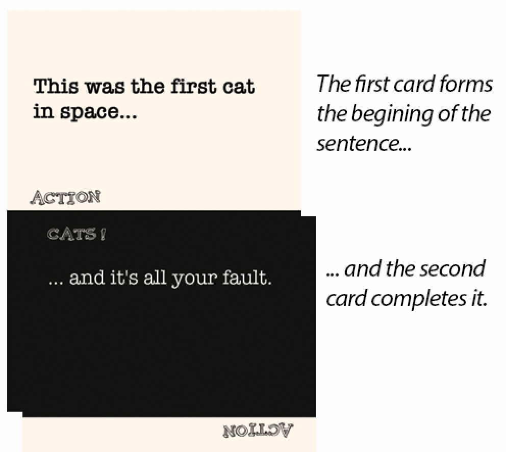 - It's compact. Each card in the deck includes two separate prompts and a cat on the back. While it's only 160 cards, there's over twenty-five thousand possible story combinations.