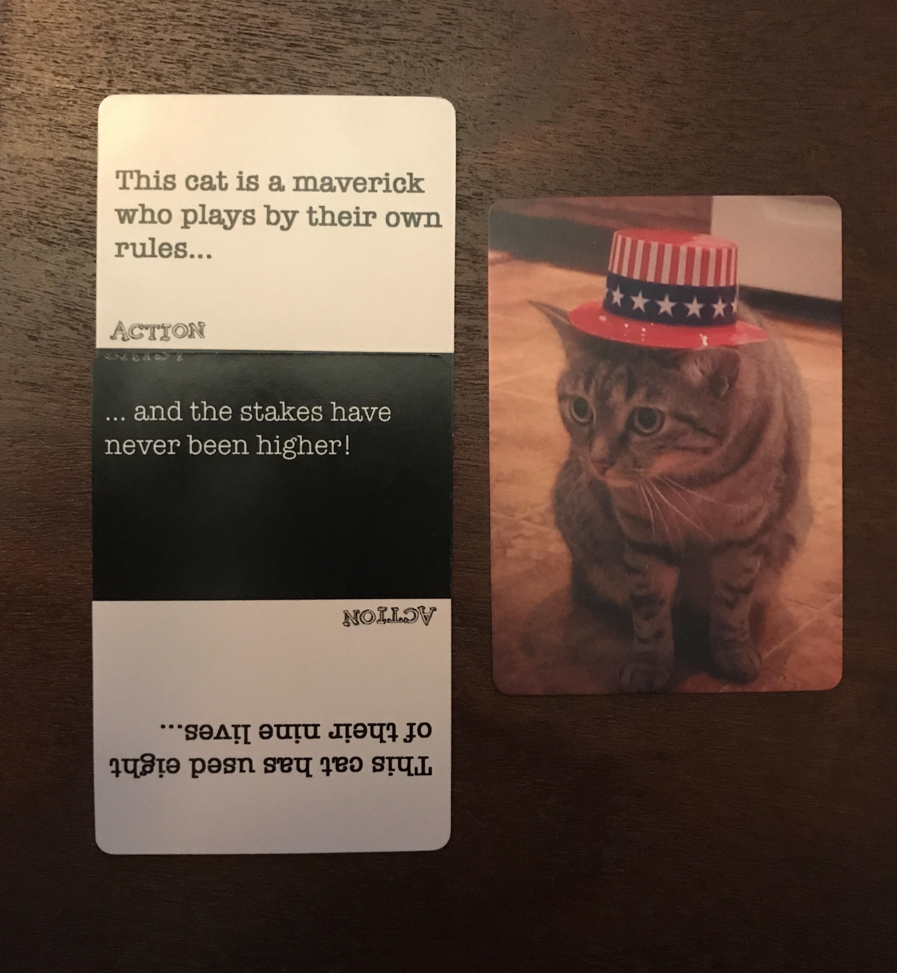 Action Cats is a simple game. Each card in the deck has a picture of a cat on one side. The other side of the card has two story prompts: the start of a sentence and the end of a sentence. One player is declared the Judge, and it goes something like this...